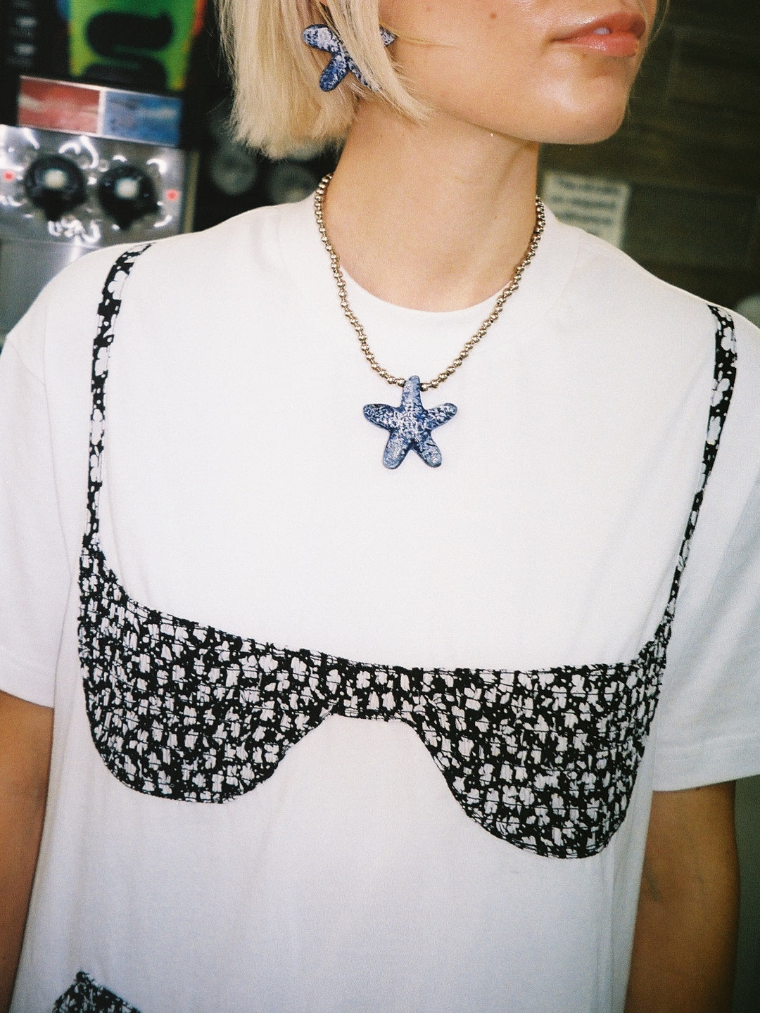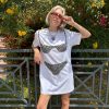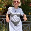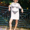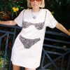 This LSG exclusive is an oversized boxy white T-shirt dress with an appliqué smocked bikini top. Each bikini is handmade from vintage fabric in NYC.