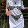 This oversized white T-shirt is a quirky take on the classic tee—but make it a dress! Its unconventional smocked bikini top, handmade from vintage fabrics in NYC, adds a playful twist to any outfit!