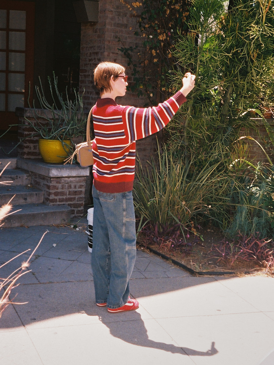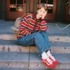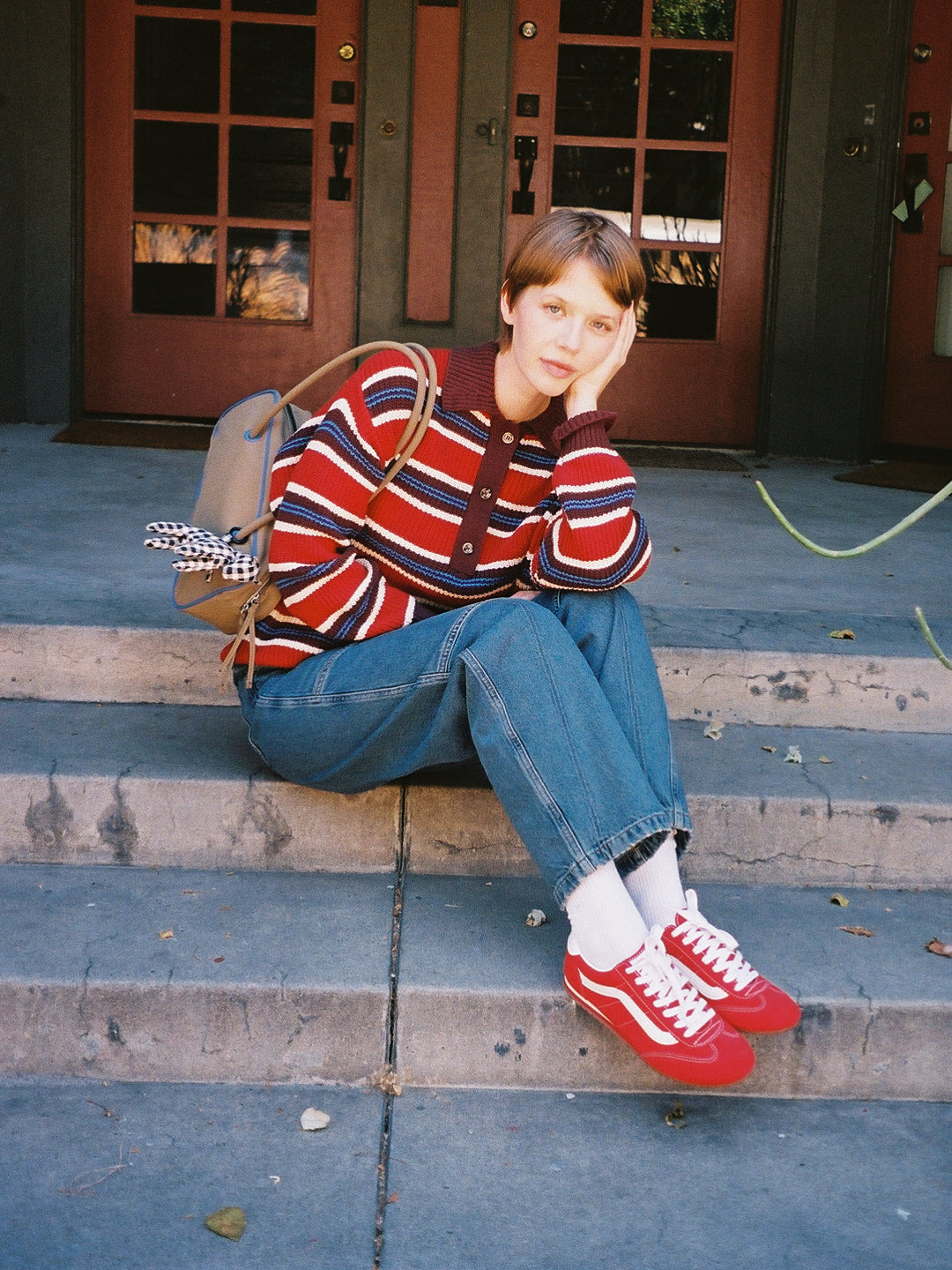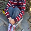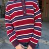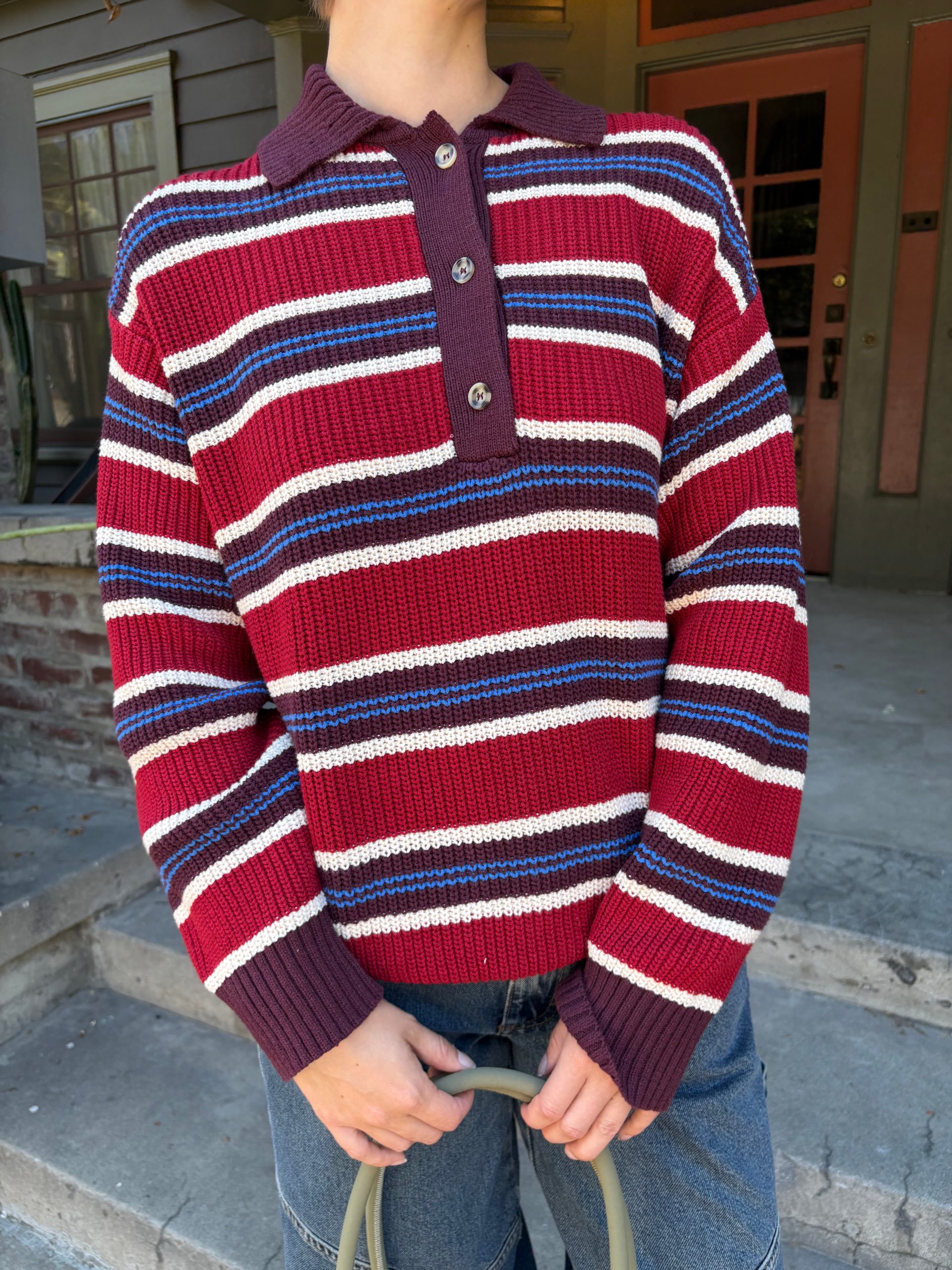 Rugby style sweater featured in a red, blue, and burgundy stripe featuring a front button down placket and an embroidered ‘DM’ logo.