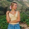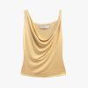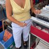 Knit top with a cowl neckline featured in a butter yellow. This top cinches at the waist for a fitted look. This stretchy knit fabric is comfortable and accounts for about 2-3in of stretch all around.