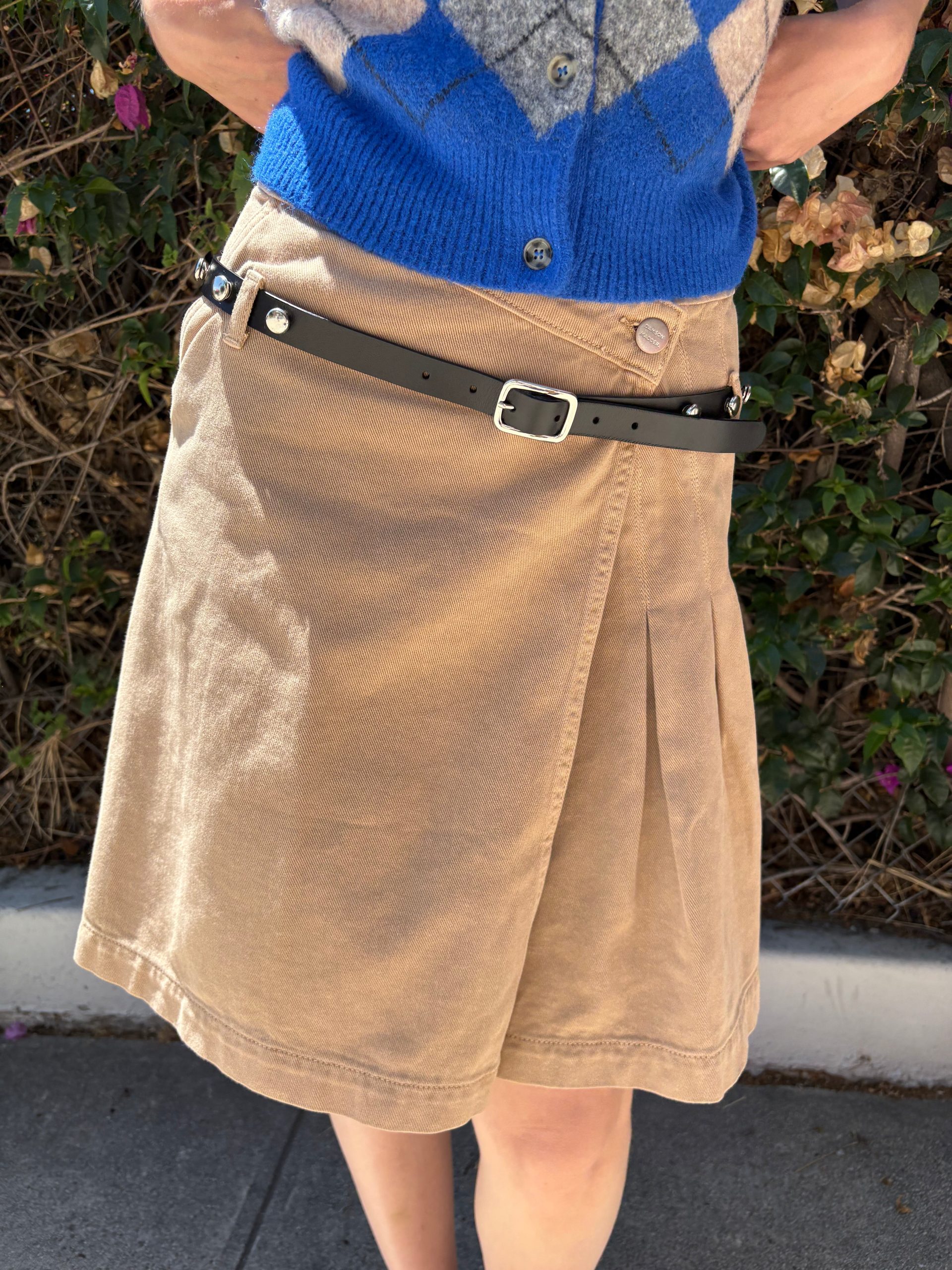 Kilt style denim skirt with side pockets, a pleated detail on the side, and a removable belt. This skirt fits knee-length and is unlined.