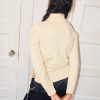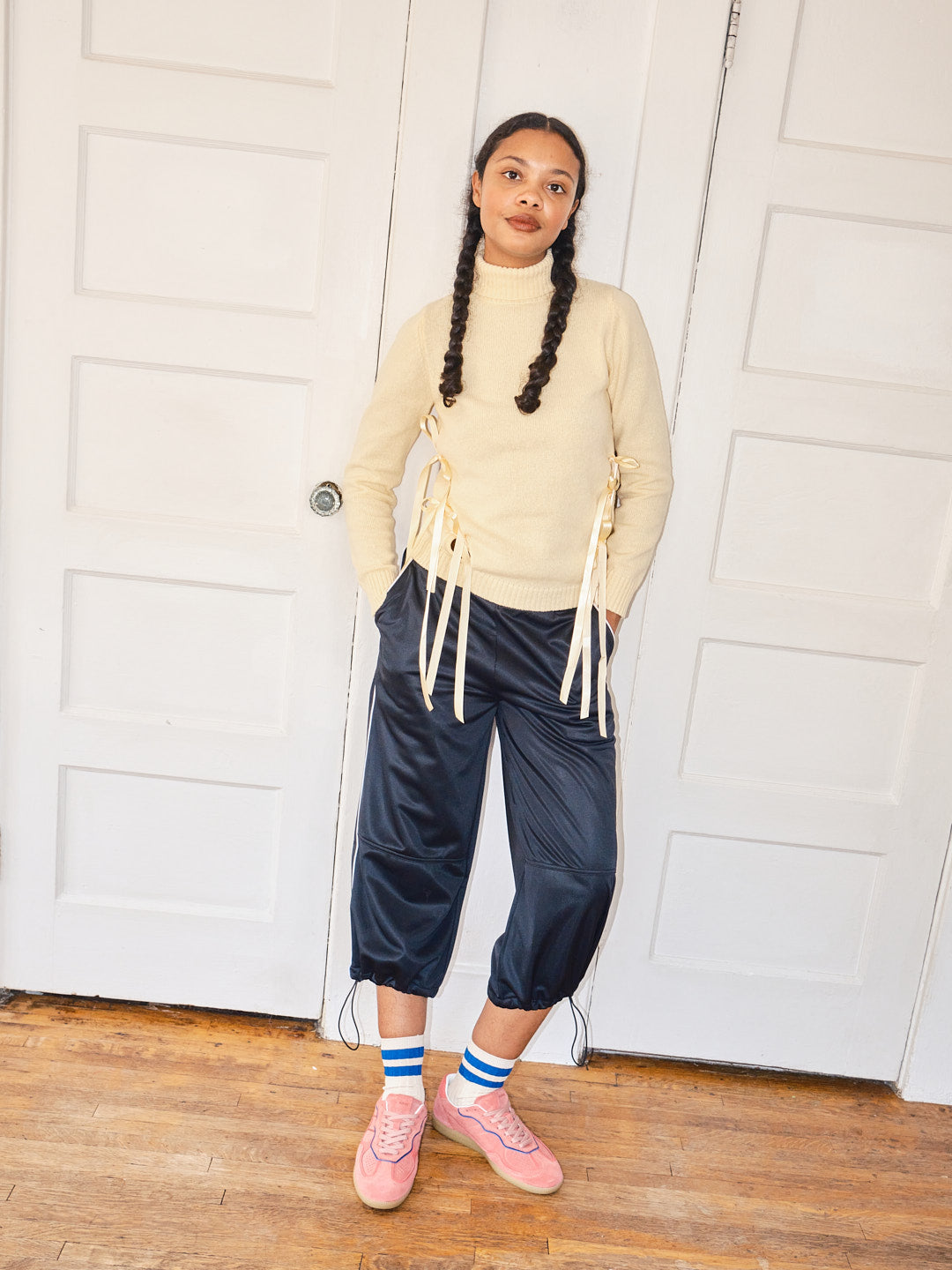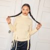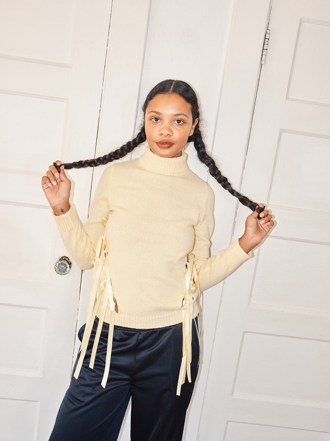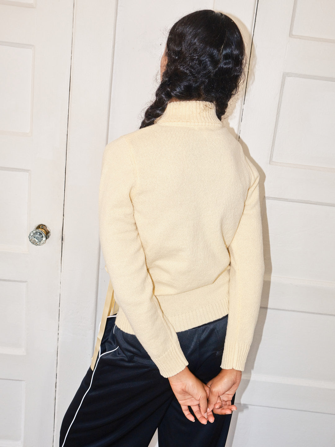 The Leona Sweater is a turtle neck sweater in a gorgeous light yellow knit, featuring ribbon bow details ascending up the bottom of the sweater to the inner-sleeve.