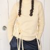 The Leona Sweater is a turtle neck sweater in a gorgeous light yellow knit, featuring ribbon bow details ascending up the bottom of the sweater to the inner-sleeve.