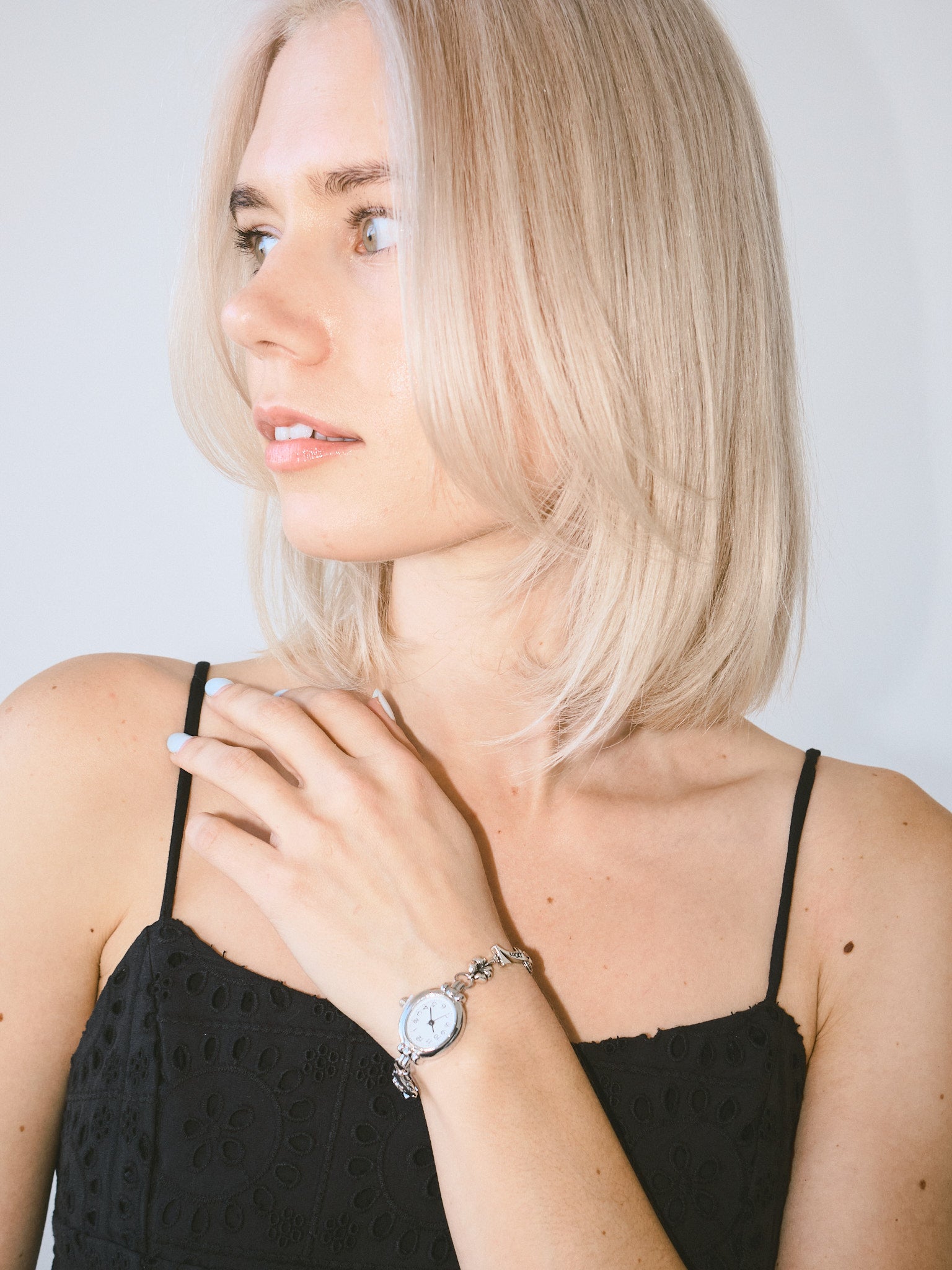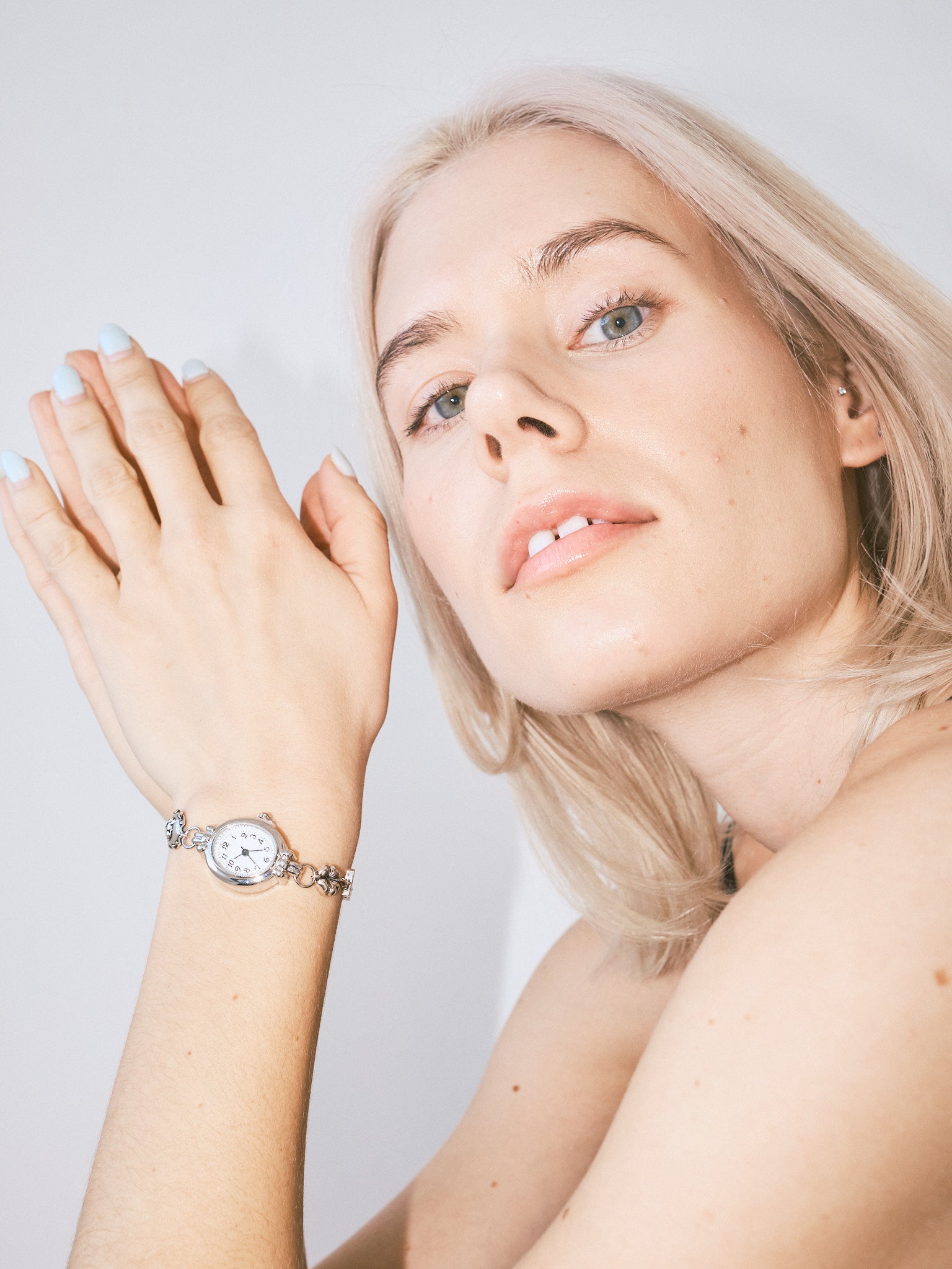 The Lucky Charms Wristwatch brings a little luck to your day. This silver watch charm bracelet features a mix of playful charms, combining the functionality of a timepiece with a touch of whimsy. A lucky addition to any outfit.