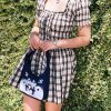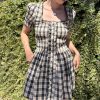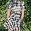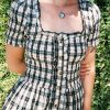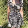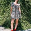Mini dress with full button front featuring a square neckline and a shirred bodice for ultimate comfort. This dress is made of 100% cotton in a fun butter check print.