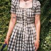 Mini dress with full button front featuring a square neckline and a shirred bodice for ultimate comfort. This dress is made of 100% cotton in a fun butter check print.