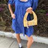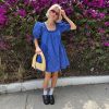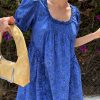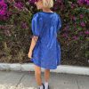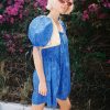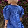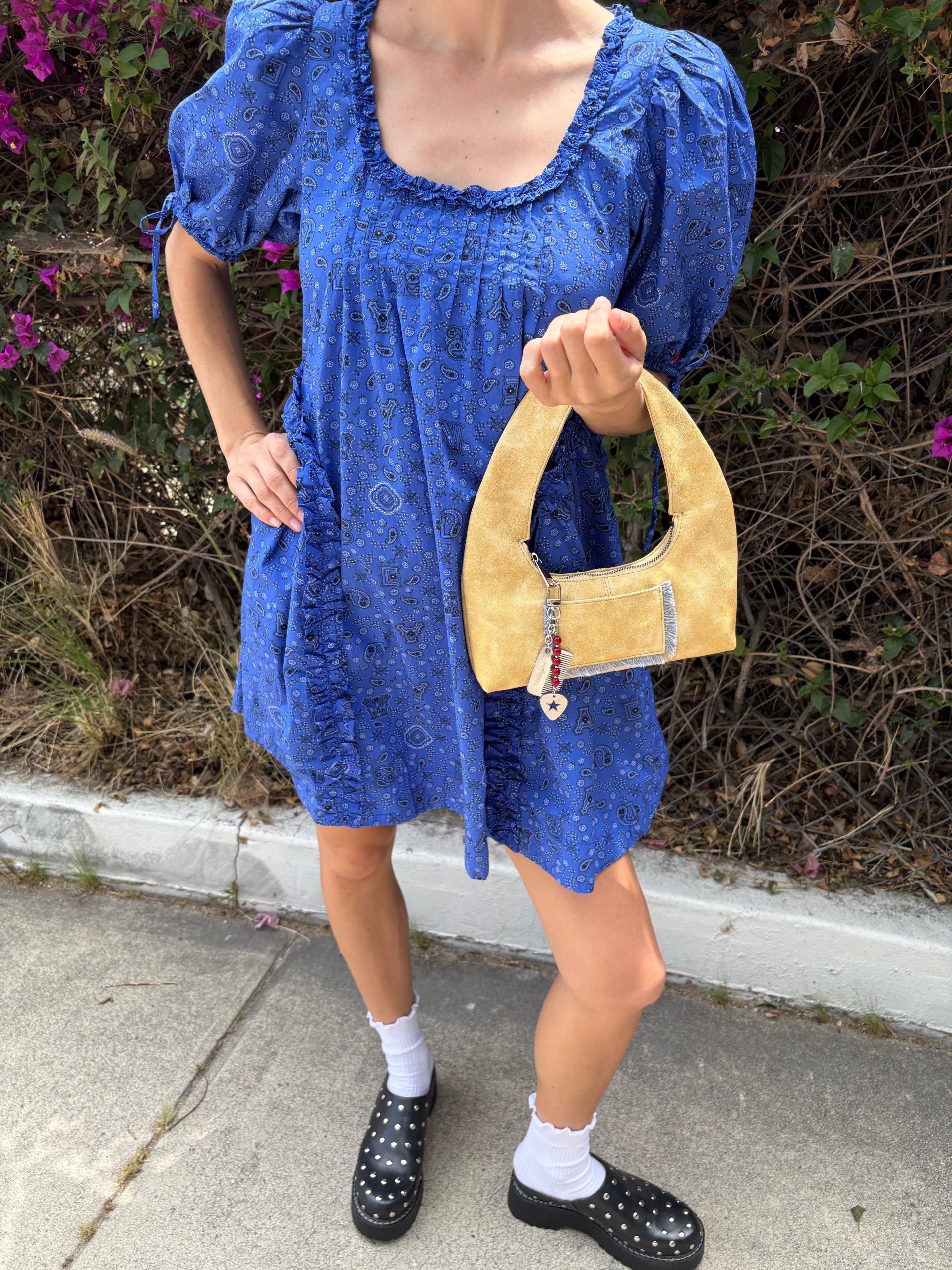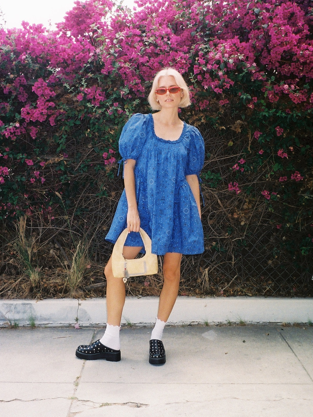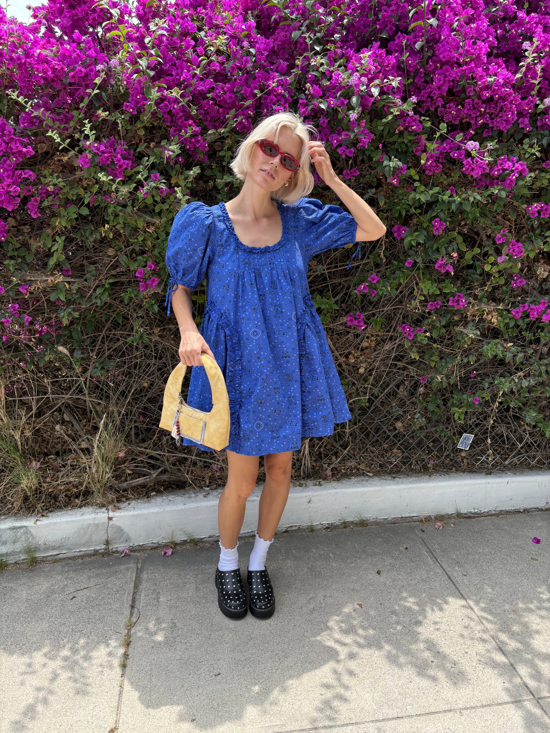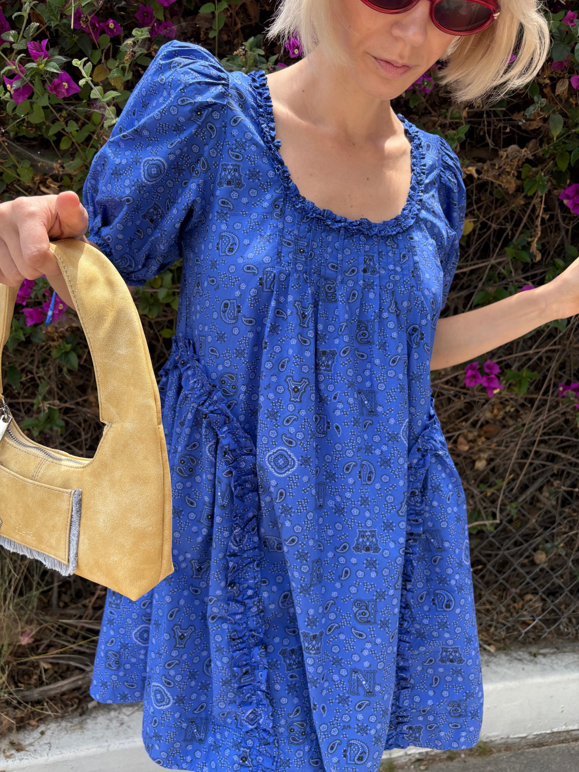 The Meri Mini Dress is a babydoll dress silhouette featuring ruffles, puff sleeves, and a gorgeous blue paisley print in an organic cotton fabric.