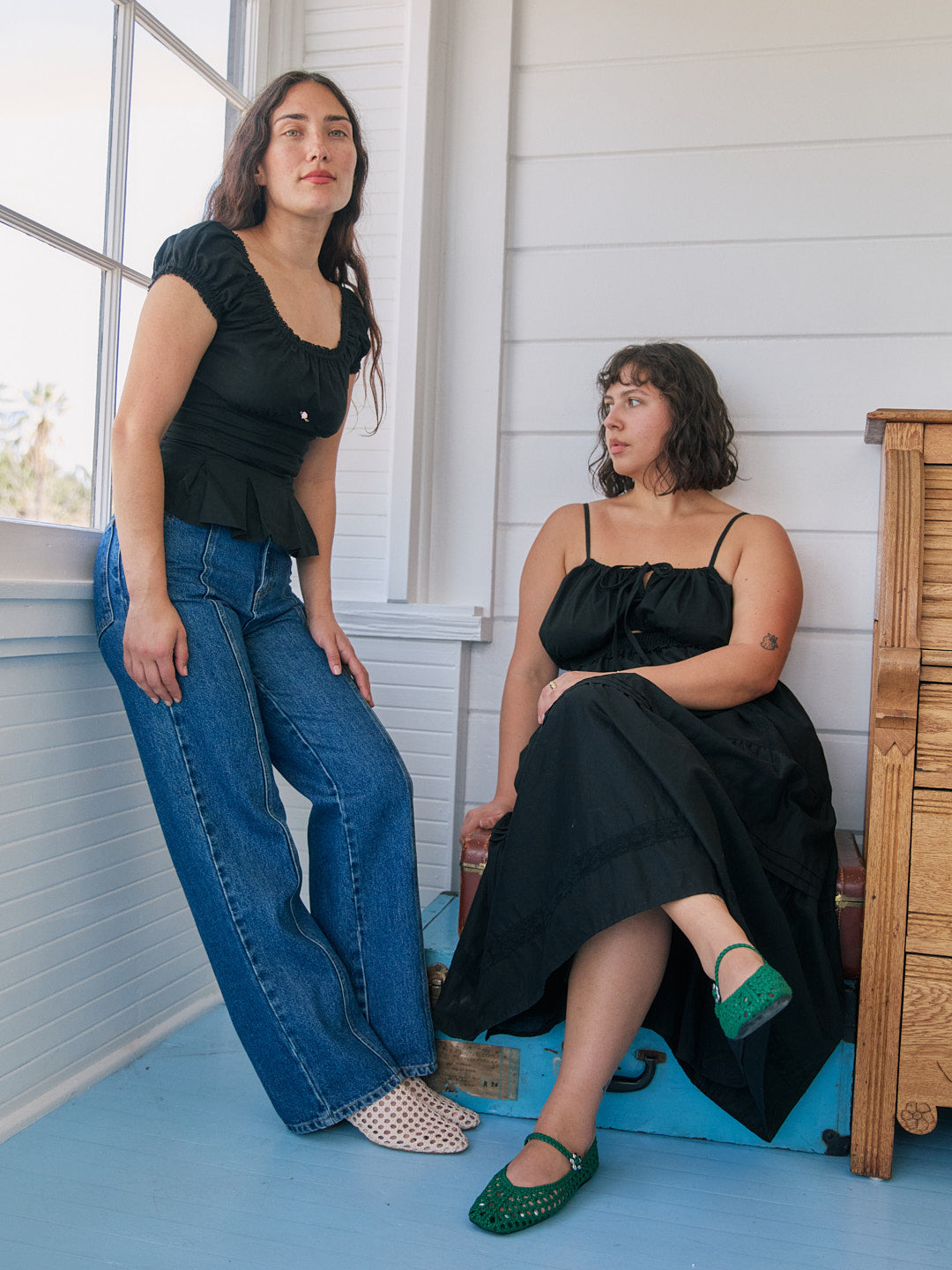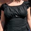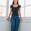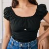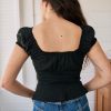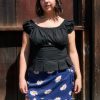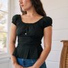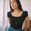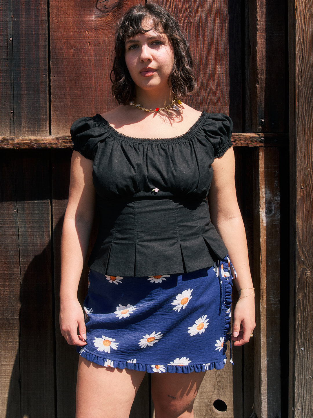 Cotton blend corset-style blouse with a sweet elasticized neckline and a ruched short sleeve for a puff-sleeve effect. This blouse has a flattering pleat at the bodice and a hidden zip closure at the side. This top runs a bit small.