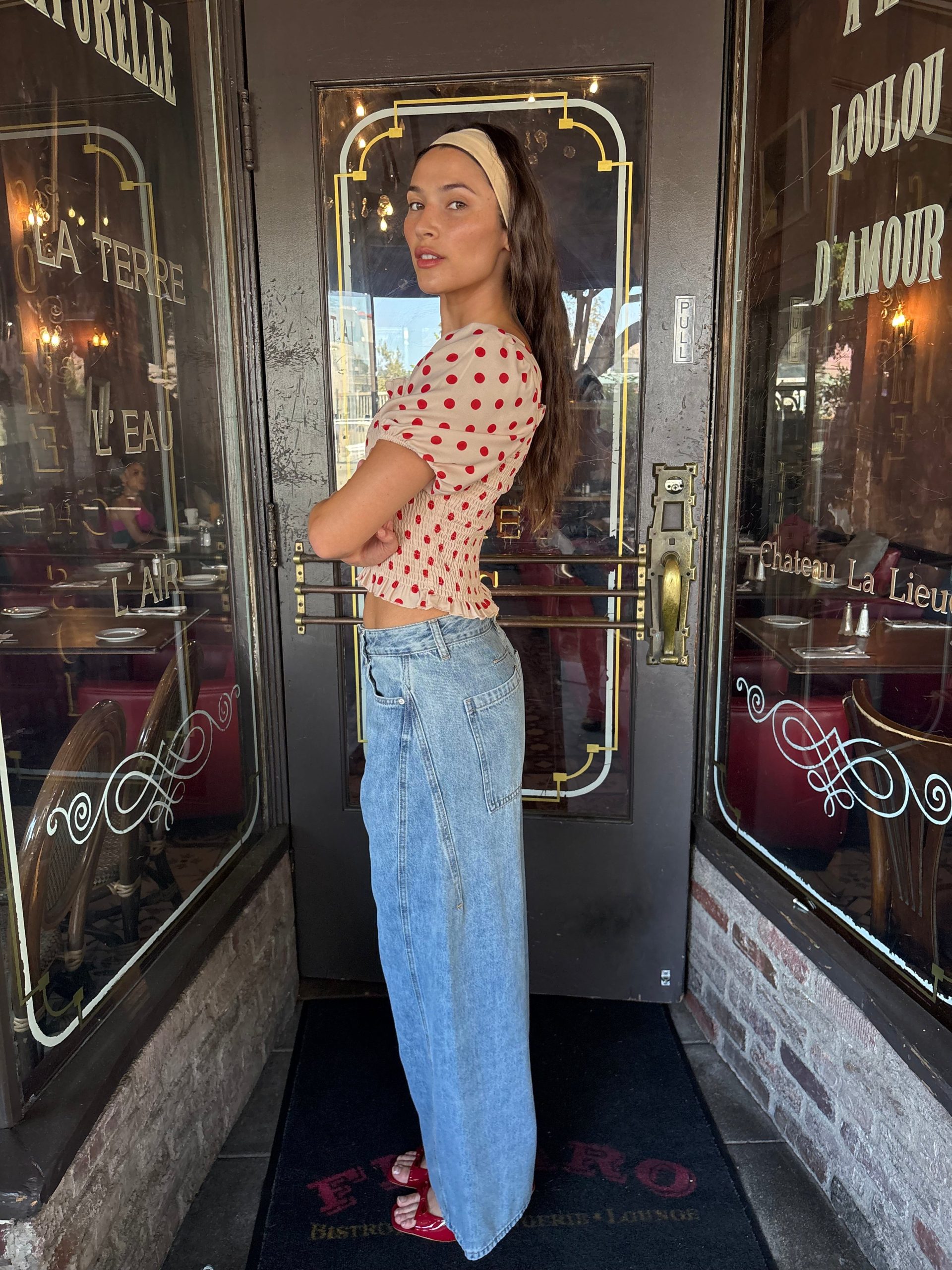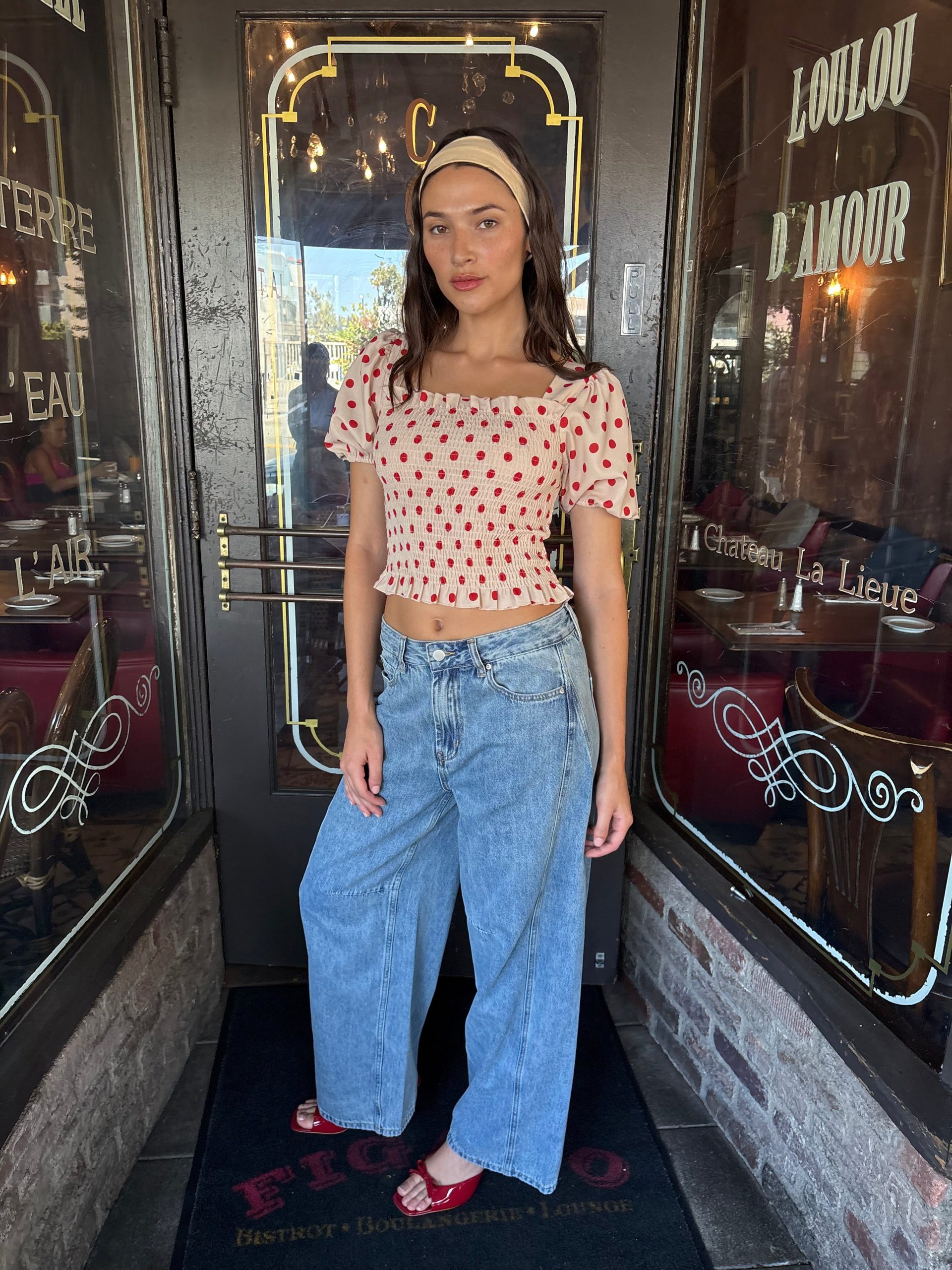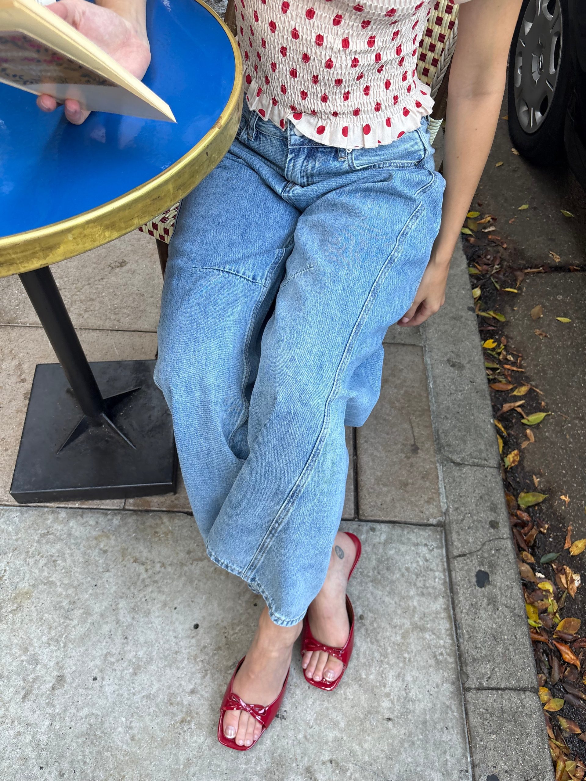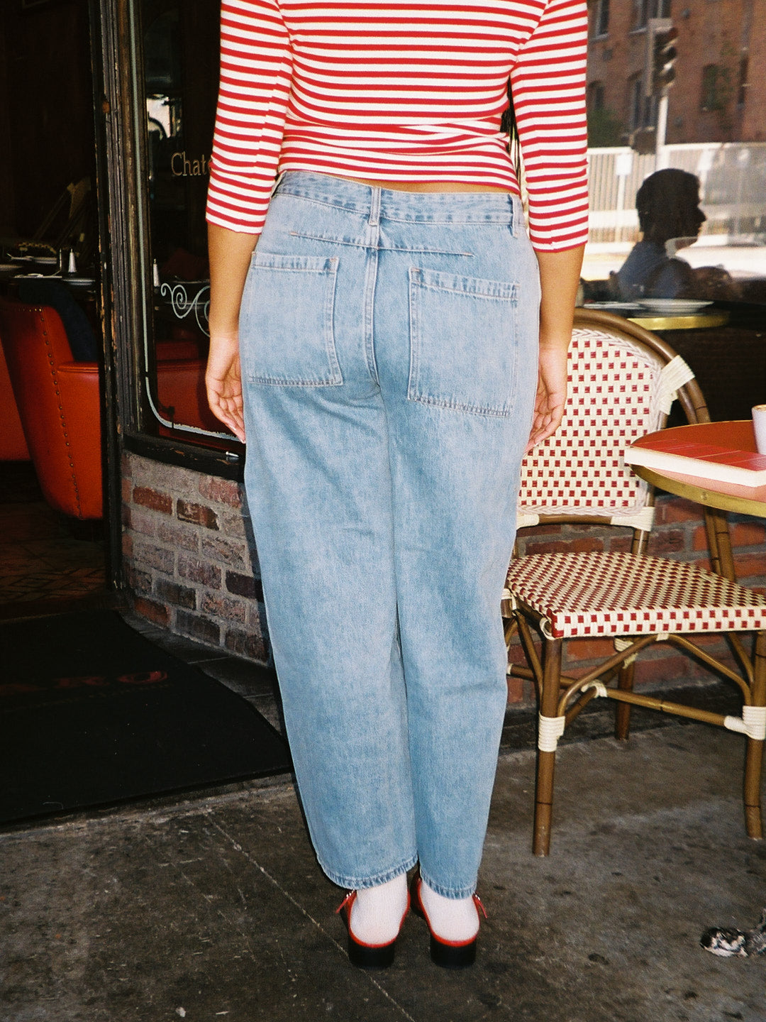 Introducing Le Petit Dot: Dots, stripes, and silhouettes made for the season in-between. The Remi jean from Loucia is a medium wash, relaxed barrel-leg denim with a high waist and a cropped inseam. These jeans are the perfect combo of chic and comfortable!