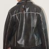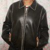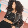 Faux leather fitted jacket with a zip closure and side-seam pockets. Featured in a vintage-inspired distressed fabric.