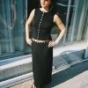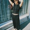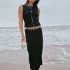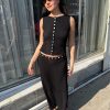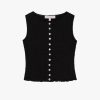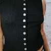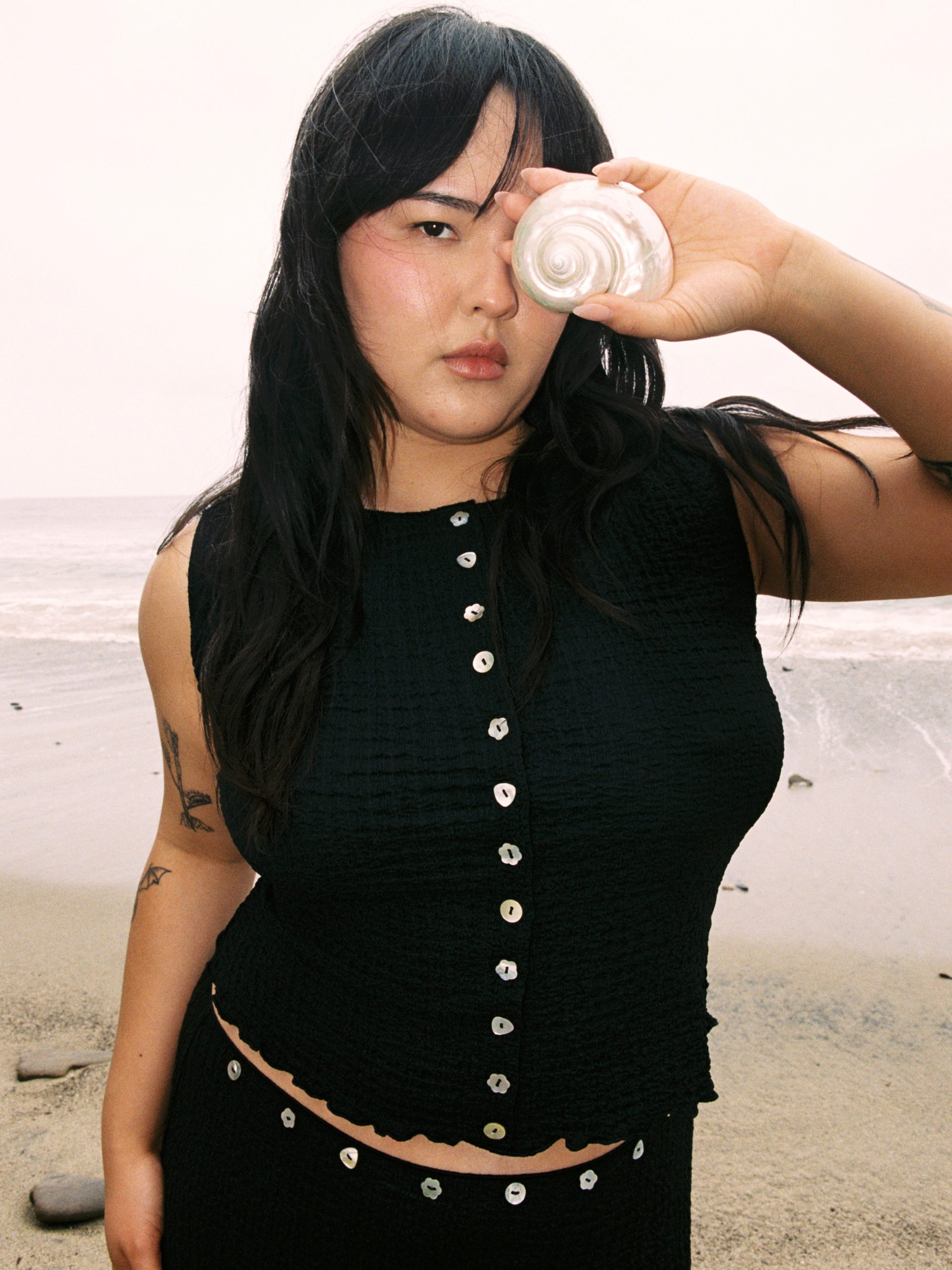 This is a sleeveless, black top made with a crinkle knit fabric. It has a round neckline and shell buttons down the front. The hem is slightly ruffled, and the fit is stretchy and snug. We recommend sizing up if you are between sizes.
