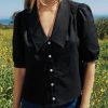 This is a sleeveless, black top made with a crinkle knit fabric. It has a round neckline and shell buttons down the front. The hem is slightly ruffled, and the fit is stretchy and snug. We recommend sizing up if you are between sizes.