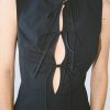 A black mini dress featuring a boat neck and 3 ties at front. Features a zipper at back. Unlined.