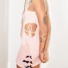 Knitted mini dress with side cut-outs and a lace-up back featuring bow accents and decorative side ties.